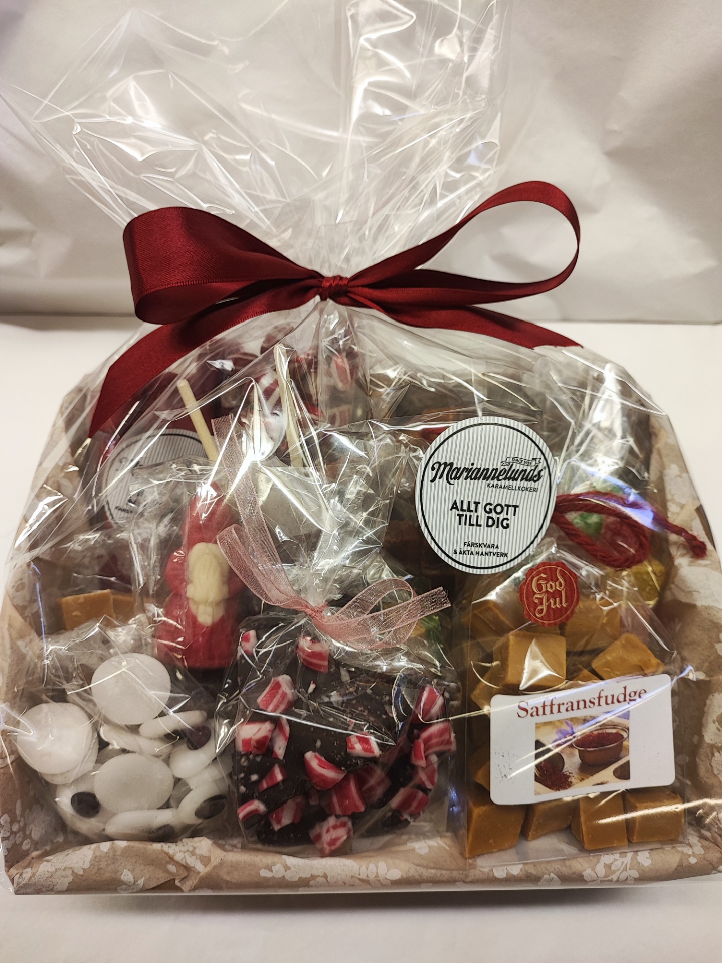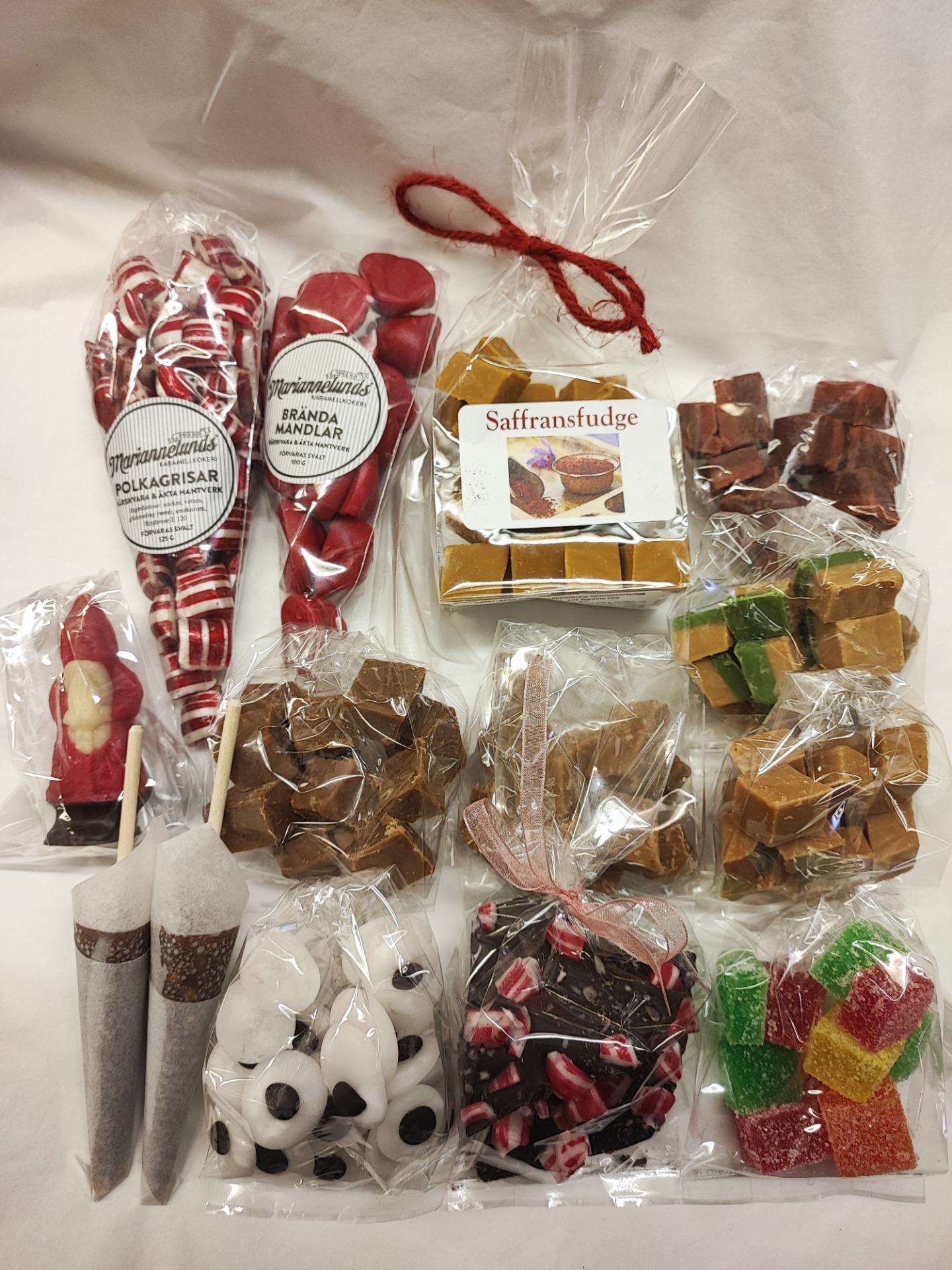 Socker, kondenserad mjölk. Choklad: Socker, härdat vegetabiliskt fett, skummjölkspulver, vasslepulver, emulgeringsmedel (sojalecitin) E322, E446. Margarin: Vegetabiliskt fett och olja (palm, raps och kokos), vatten, salt (1,5%) emulgeringsmedel (322 (solros), E471, E475), skummjölkspulver, hasselnötter, sötmandel, agar-agar, citronsyra, äppelmos, kokosfett, aromer, vitamin A och D, glykossirap, lakritspulver, salmiak, vispgrädde, saffran, färgämne E153, E150, E120, E104, E160a.