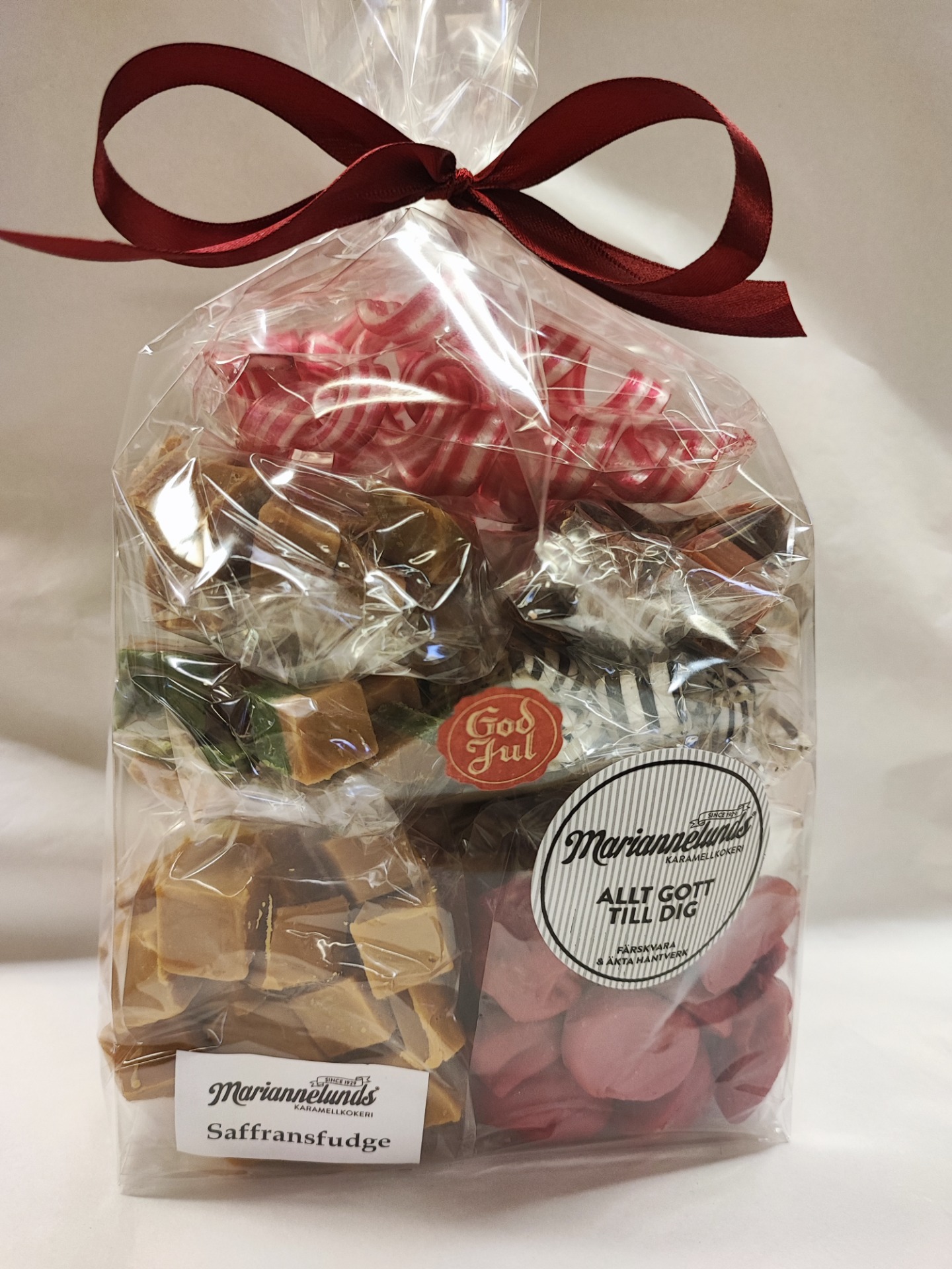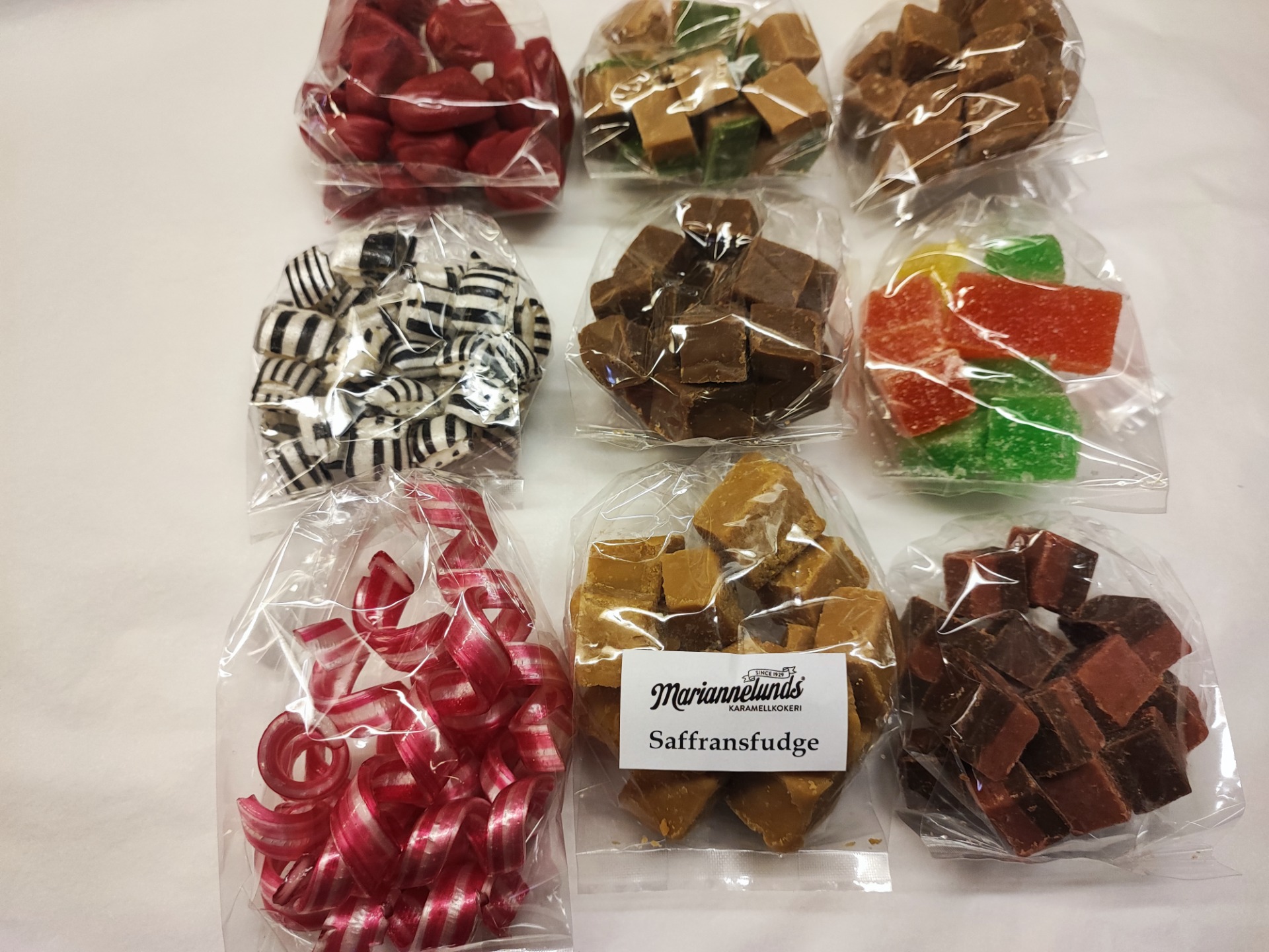 Socker, kondenserad mjölk. Choklad: Socker, härdat vegetabiliskt fett, skummjölkspulver, vasslepulver, emulgeringsmedel (sojalecitin) E322, E446. Margarin: Vegetabiliskt fett och olja (palm, raps och kokos), vatten, salt (1,5%) emulgeringsmedel (322 (solros), E471, E475), skummjölkspulver, hasselnötter, sötmandel, agar-agar, citronsyra, äppelmos, kokosfett, aromer, vitamin A och D, glykossirap, lakritspulver, salmiak, vispgrädde, färgämne E153, E150, E120, E104, E160a.